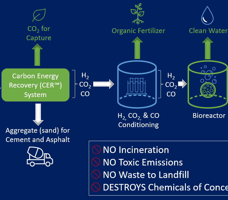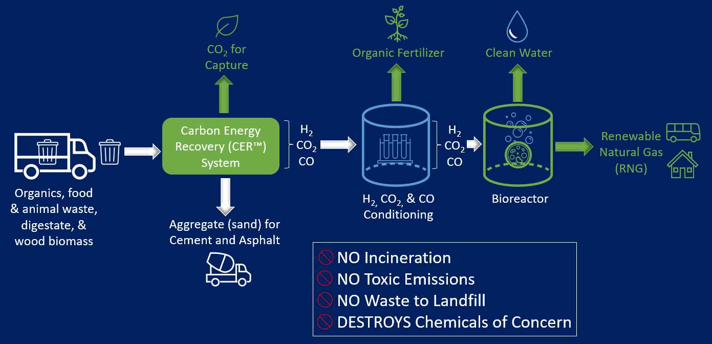 BRADAM’s patented CER™ System and facility design provide an environmentally responsible way to divert any carbonaceous materials from landfills and convert them into pipeline grade Renewable Natural Gas (RNG), Green Hydrogen (GH2), and Substitute Natural Gas (SNG). Byproducts like biogenic carbon dioxide for capture, fertilizer, inert aggregate used in the production of asphalt and cement, and clean water are produced during processing as well.